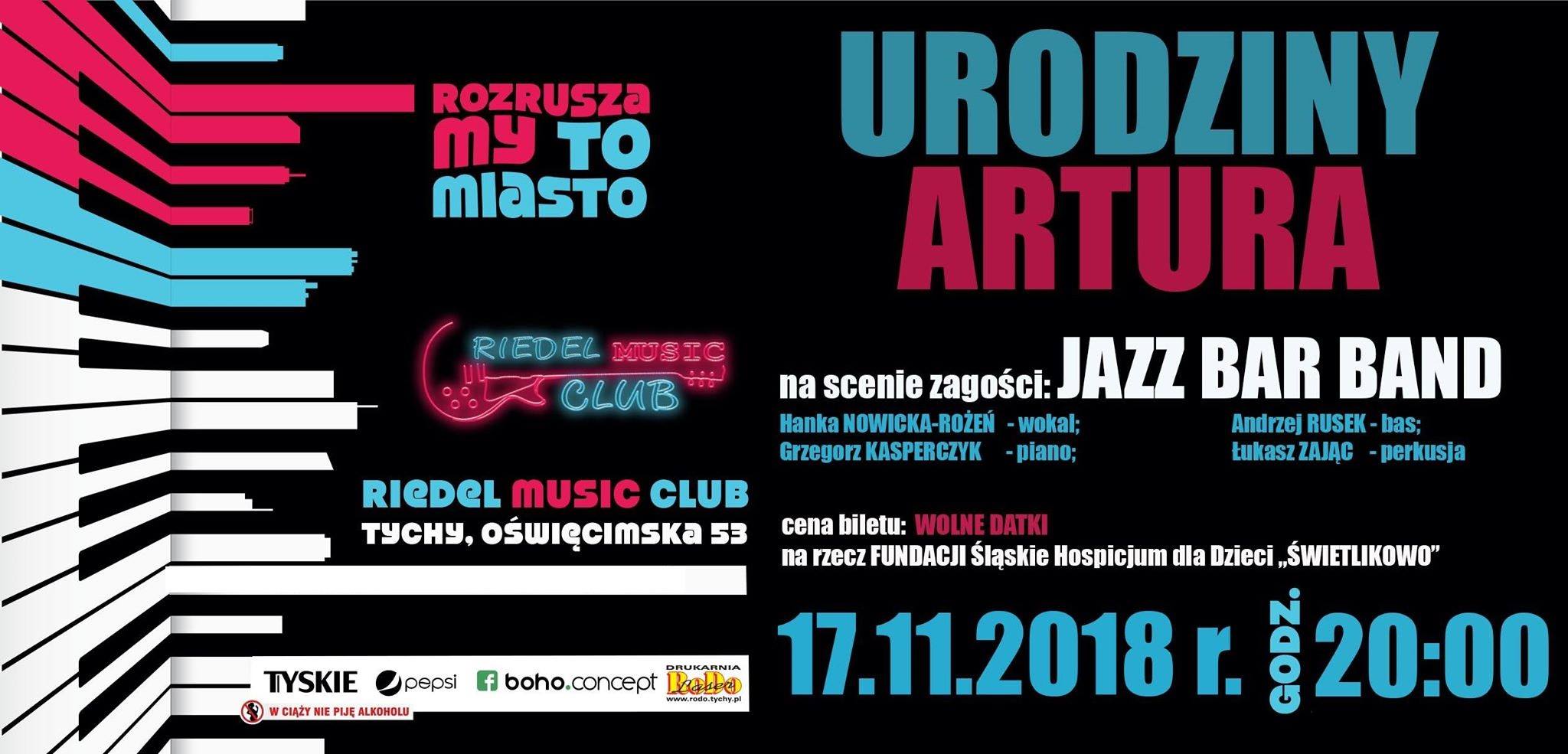 Zapraszamy serdecznie na urodziny "Szefa Artura" :) Nie znasz? Nie szkodzi! Przyjdź i jako prezent wesprzyj Śląskie Hospicjum Domowe dla Dzieci, wrzucając wolny datek...najlepiej duży ;)! Na scenie zagości "Jazz Bar Band"!