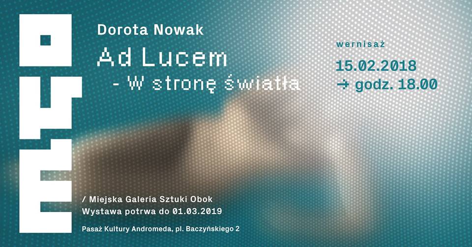 Wernisaż wystawy zatytułowanej "Ad Lucem - w stronę światła", autorstwa Doroty Nowak, odbędzie się 15 lutego o godzinie 18:00 w Pasażu Kultury Andromeda. Wystawa potrwa do 28 lutego. Szczegóły w Miejskiej Galerii Sztuki "Obok".
