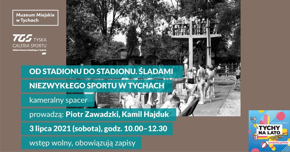 Sobotnie letnie przedpołudnie warto spędzić wędrując śladem niezwykłych tyskich sportowych miejsc. To wędrówka od pierwszego w nowym mieście stadionu Polonii Tychy przy ul. gen. Władysława Andersa na osiedlu A do nowoczesnego Stadionu Zimowego przy ul. gen. Charlesa de Gaulle’a. Będzie okazja do zwiedzenia najciekawszych i zwykle niedostępnych przestrzeni Stadionu Miejskiego, nowego obiektu lekkoatletycznego, hali lodowiska z hokejowym zapleczem oraz wielu innych miejsc ważnych dla historii sportu w Tychach. Uczestnicy i uczestniczki spaceru będą mogli przenieść się w czasy początków sportu w mieście i, używając kodu QR, wyświetlać na swoich telefonach komórkowych archiwalne zdjęcia sportowych obiektów w Tychach. Przewidziane są również konkursy wiedzy o historii sportu w Tychach z nagrodami.