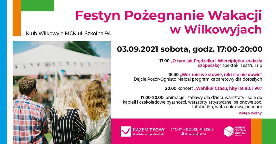 W piątek 3 września zapraszamy serdecznie na Festyn Pożegnanie Wakacji w ogrodzie Klubu Wilkowyje MCK, który odbywa się w ramach Budżetu Obywatelskiego Miasta Tychy 2021.