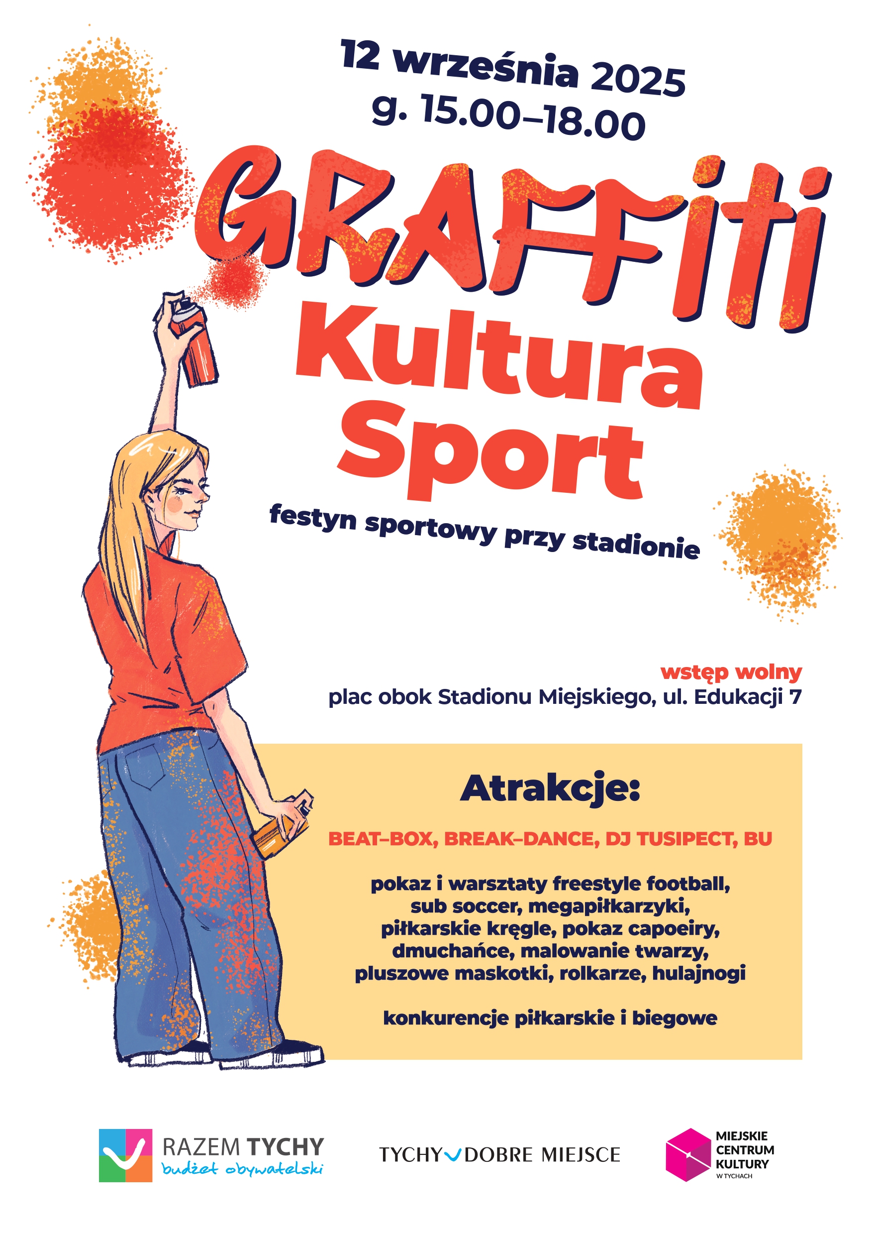 Zapraszamy w piątek, 12 września 2025 r. w godz. 15.00–18.00 na plac obok Stadionu Miejskiego przy ul. Edukacji 7. W programie m.in. pokazy beat–boxu, break–dance’u, DJ TUSIPECT i BU, warsztaty freestyle football, sub soccer, megapiłkarzyki, piłkarskie kręgle, capoeira, a także konkurencje piłkarskie i biegowe.