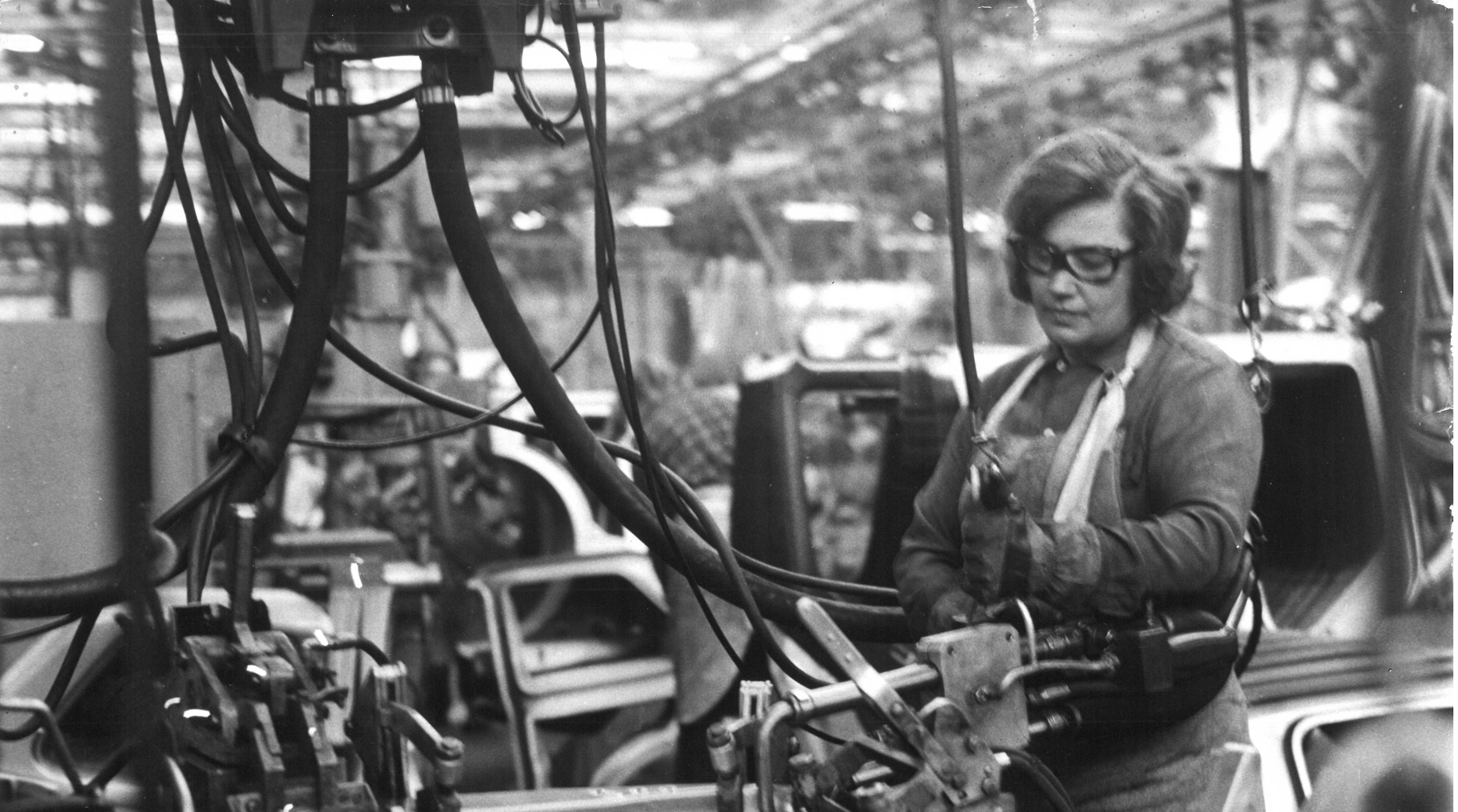 fot. kobieta podczas pracy na wydziale spawalni – procesu zgrzewania karoserii samochodu, II połowa lat 70. XX wieku, fot. Danuta Rago, Zbyszko Siemaszko, własność FCA Poland, depozyt Muzeum Miejskiego w Tychach