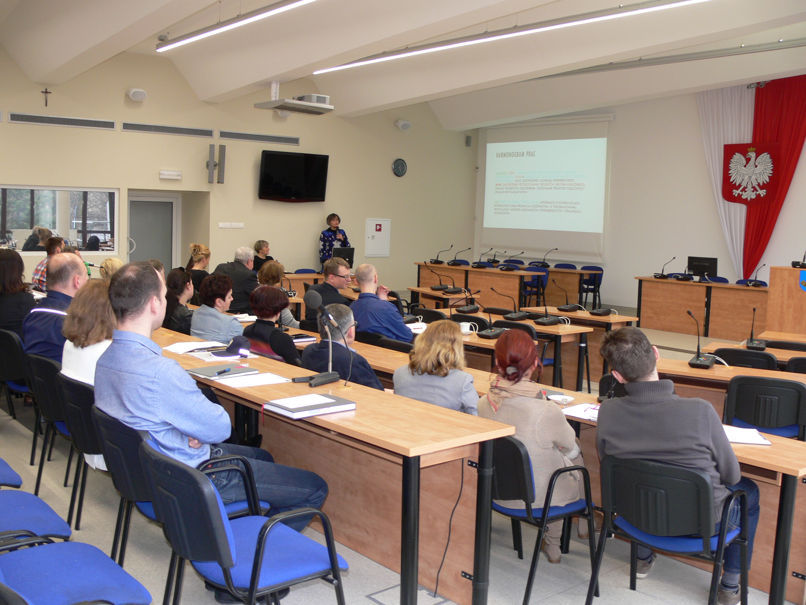 Spotkanie było przeznaczone dla sektora publicznego. W spotkaniu wzięło udział 36 przedstawicieli Urzędu Miasta oraz jednostek organizacyjnych Miasta. Celem spotkania było omówienie najważniejszych etapów tworzenia Programu Rewitalizacji oraz przedstawienie zakresu planowanej współpracy sektora publicznego przy jego tworzeniu. Moderatorem spotkania była Dagmara Mliczyńska-Hajda – wieloletni ekspert w dziedzinie rozwoju i rewitalizacji polskich miast, która podczas spotkania przedstawiła ogólne założenia dotyczące rewitalizacji oraz metodykę prac nad Programem Rewitalizacji dla miasta Tychy wraz z harmonogramem prac, a także poprosiła uczestników spotkania o wypełnienie ankiety. Ankieta dotyczyła między innymi wskazania obszarów najbardziej wymagających rewitalizacji. Spotkanie zakończyła krótka dyskusja na temat rewitalizacji w Tychach.