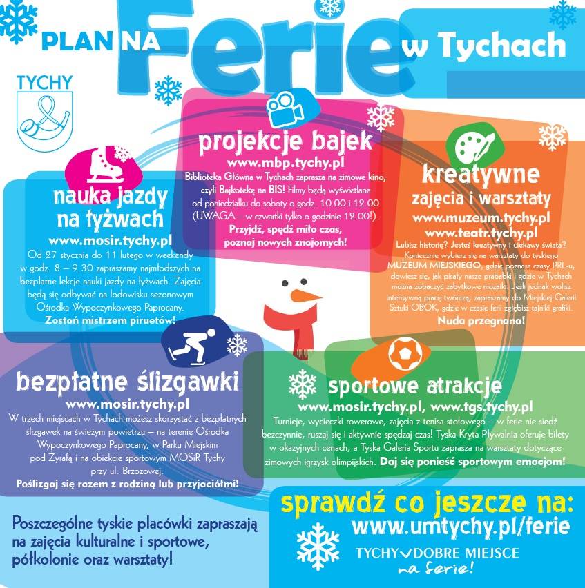 Zachęcamy do zapoznania się z zaplanowanymi na czas ferii atrakcjami! Tychy to dobre miejsce także dla zimowego wypoczynku.