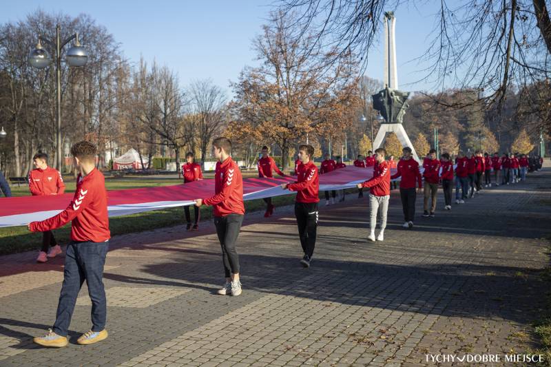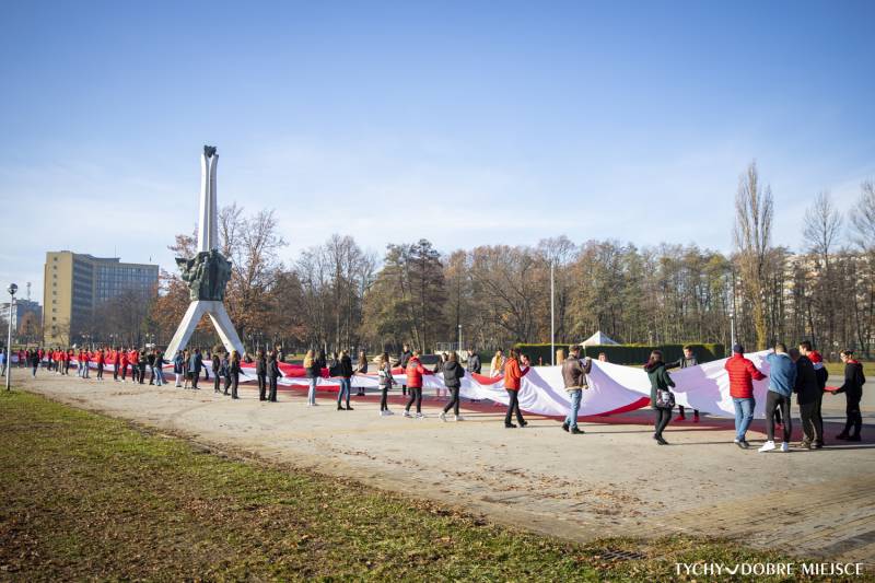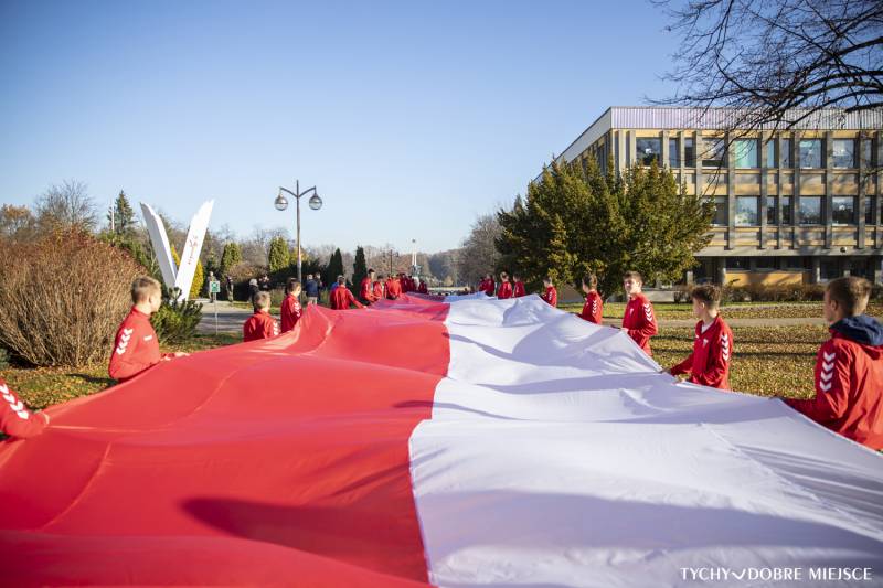 11 Listopada jutro, ale już dziś dzieci i młodzież z tyskich placówek oświatowych obchodziły święto Niepodległości. Uczniowie z Zespołu Szkół nr 1 przynieśli przed Pomnik Niepodległości 100-metrową flagę, a dzieci z Przedszkola ABC flagę uszytą własnoręcznie przez grupę 6-latków.