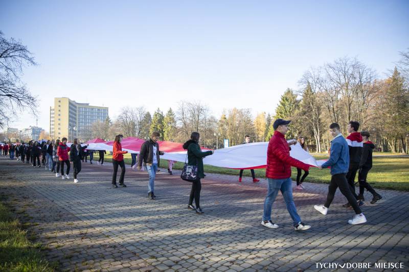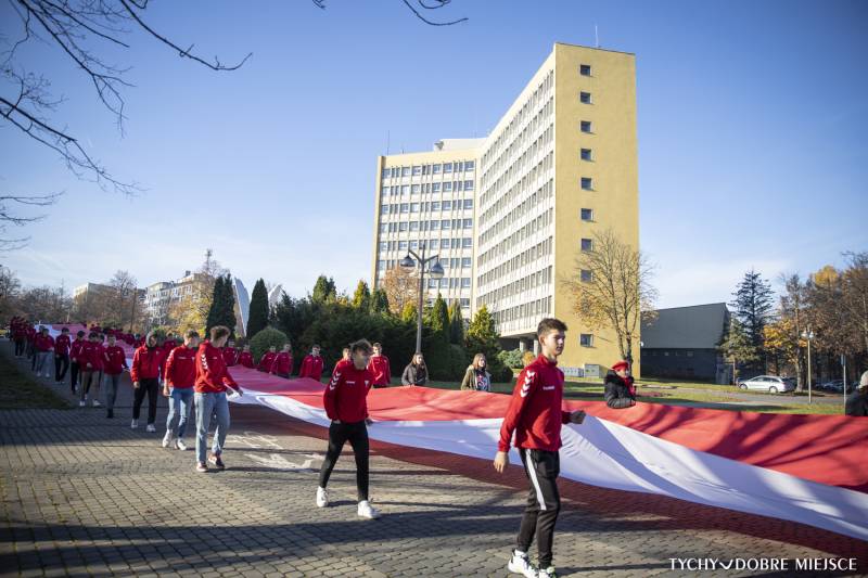 W liceum im. Gustawa Morcinka 10 listopada młodzież ubrała się na biało - czerwono, każda klasa upiekła ciasto – w barwach narodowych, a grupa 50-ciu uczniów klas sportowych przemaszerowała ze stumetrową flagą narodową przed Żyrafę i Pomnik Niepodległości.