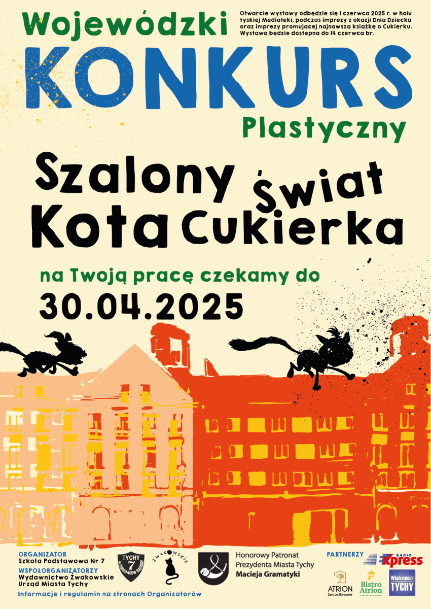 Miasto Tychy, Wydawnictwo Żwakowskie oraz Szkoła Podstawowa nr 7 im. Powstańców Śląskich w Tychach zapraszają do udziału w kolejnej edycji konkursu plastycznego „Szalony Świat Kota Cukierka". Przeznaczony jest on dla uczniów przedszkoli i szkół podstawowych z woj. śląskiego. Prace można przesyłać do 30 kwietnia.