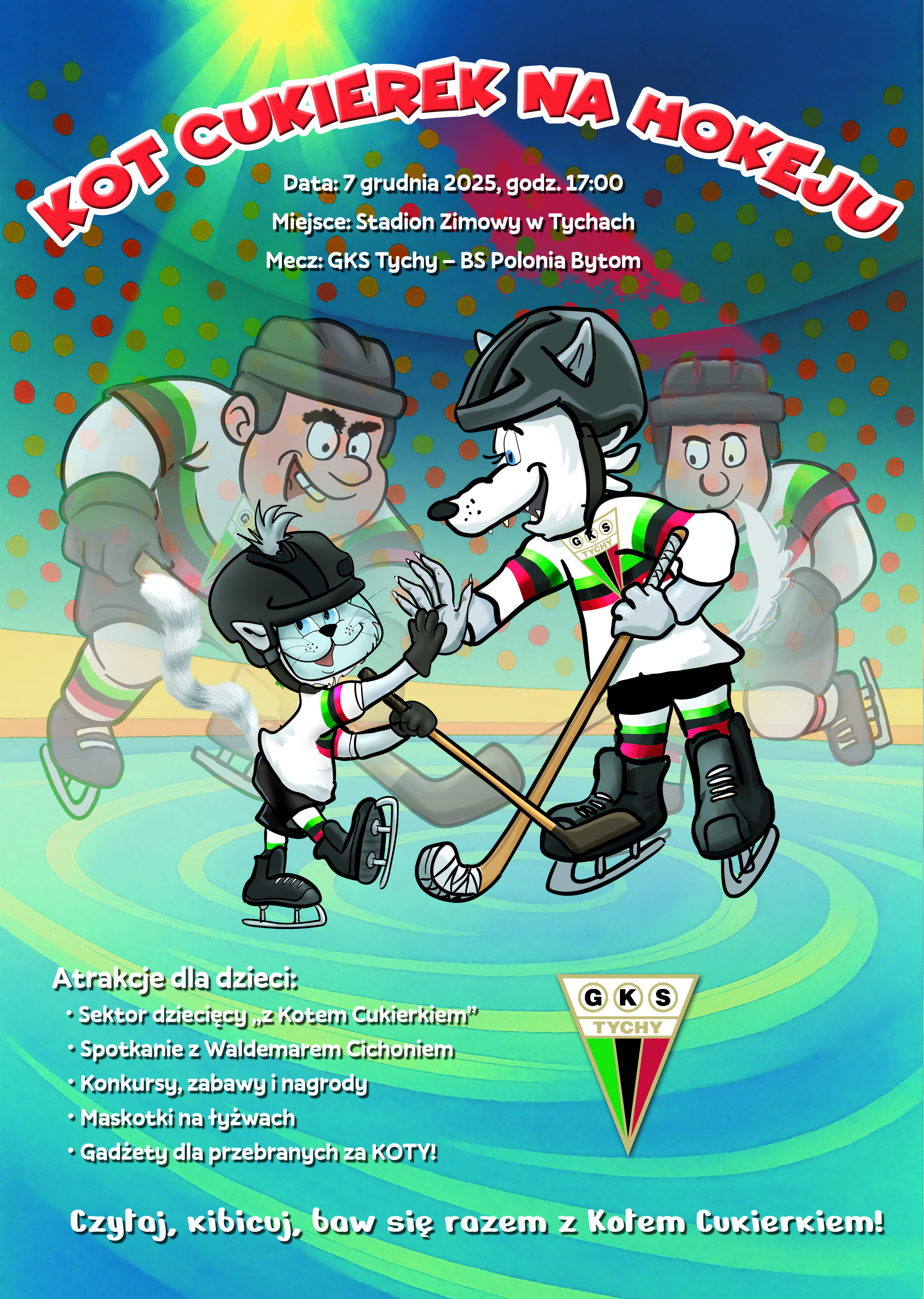 Nie od dziś wiadomo, że Kot Cukierek jest wielkim fanem hokeja na lodzie. Dlatego dla wszystkich małych kibiców przygotował, wraz z hokeistami, sporo atrakcji. Wśród nich: sektor dziecięcy z Kotem Cukierkiem, spotkanie z autorem książki/tatą Cukierka - Waldemarem Cichoniem konkursy, zabawy, nagrody maskotki na łyżwach debiut Kota Cukierka na lodzie, dodatkowo gadżety dla dzieci przebrane za KOTY